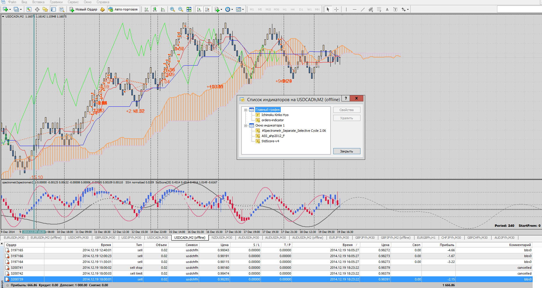 Кроме спектрометра, в то же окно добавлены: название:ASS_ahp2012_F.mq4 - это кажется от "гусеницы", но чистой гусеницей (там куча таких линий с разными настройками) я не пользуюсь, потому что не очень понимаю как это "читать". Линия данного индикатора модулирована рынком (в терминологии автора) больше чем линия спектрометра и отражает, как я понимаю, не тенденцию, а текущее положение. В зависимости от расположения этой линий относительно линий спектрометра можно делать различные выводы. название:StdScore-v4.mq4 - полосы боллинджера, только расположены в нижнем окне и в виде свечей - их я применяю в дополнение к спектрометру и ASS_ahp2012_F.mq4. Такой набор - это чисто экспериментальный вариант. В основном окне еще есть УГЛЫ ИВАНА, так это углы Ганна, но с некоторыми настройками автора. Относительно спектрометра, я его фиксирую по нижнему и верхнему уровню, иначе он будет "гулять" и пересечения с другими линиями могут быть совсем не актуальными. Для каждой валюты и данной волатильности, настройки будут разными. Но "плавающий" спектрометр интерпретировать трудно, поэтому думаю лучше один раз зафиксировать, если видите, что нижние или верхние линии уже вылезают за границы - просто уменьшить масштаб в настройках спектрометра. Недостаток спектрометра, что в некоторых случаях его волны не будут отражать точный уровень возможного движения цены вверх или вниз. То есть большому размаху волны может соответствовать небольшое движение цены. Вот тут и помогают дополнительные индикаторы, включая и волны Эллиота, что бы понять на какой размах цены расчитывать. |