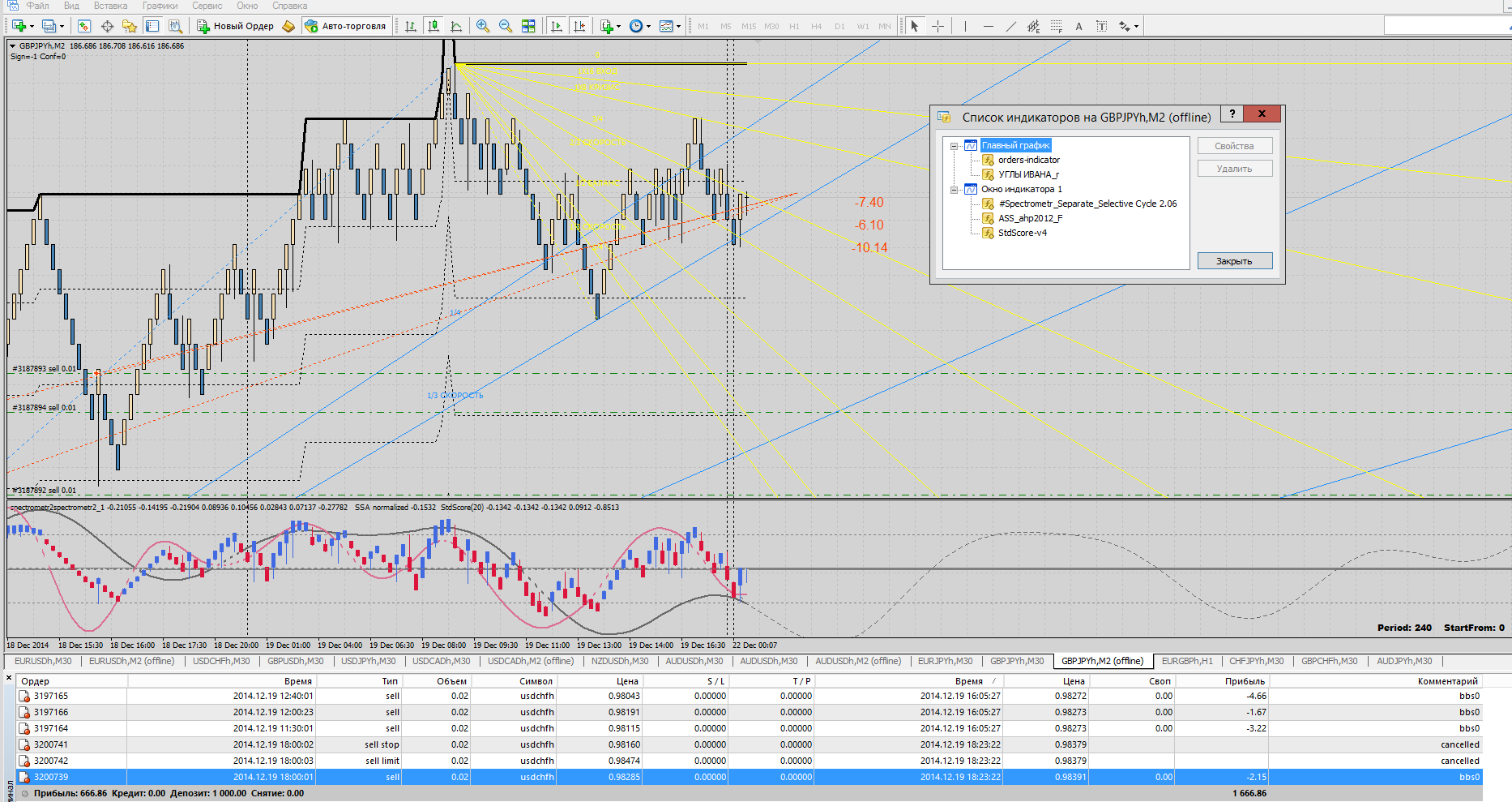 Если кратко, автор (zvzik) делает разметку циклов по оси времени с помощью индикатора (#Spectrometr_Separate_Selective Cycle 2.06.mq4, ну либо его модификаций) и временнЫх зон фибо, в которые вводит свои дополнительные константы. Ценовые (и временнЫе) уровни дополнительно размечаются Эллиотом, Ганном и фибо (фибо то же с введением дополнительных уровней). Использует автор для этого спектр из семи или меньшего количества волн в спектре и по главной волне (на текущий момент) делает разметку, вернее сказать сначала отмечает ВременнЫе зоны фибо(вертикальные линии), ориентирует их на предыдущие максимум и минумум и по этим отметкам подгоняет параметры спектрометра. Волны Эллиота определяет одним из легких способов, с помощью AO(Awesome Oscillator). Относительно спетрометра, сейчас есть и более продвинутые, с одной стороны, варианты, со сложными настройками, в результате которых индикатор будет отображаться не только по горизонтальной оси, но и под наклоном, будет возможно изменение и амплитуды во времени и ее искажение. Но единственное, что я видел, это платный вариант и потому толку от него никакого. К тому же, если кто заинтересуется темой и прочитает теорию, все эти искажения за деньги легко сделать в уме и за бесплатно. К тому же эффективность показывает на практике не усложнение индикаторов и прочего, а наоборот, упрощение до разумного. Тех, кто заинтересуется, призываю все таки прочитать материал, ссылки на который есть выше, по следующим причинам. Во-первых, те кто еще учится, могут в комплексе ознакомится с Эллиотом, Ганном и различным применением фибо. Автор к тому же делает периодически отсылки на различную дополнительную литературу по этим тематикам. Лишним такое прочтение точно не будет. Правда, у автора есть и свое мнение относительно отдельного применения методик - напр. элиотчики (те, которые используют преимущественно только один подход) и другие (то есть он критикует односторонний подход, говоря, что это лишь "часть картины мира"). Посыл автора, на мой взгляд, следующий. Волны Эллиота являются внутренним наполнением циклов; а так же то, что время жизни циклов предопределено заранее (если совсем упростить сложные математические выкладки, то находясь на меньшей волне в настоящем времени, можно определить более старшую волну, а по ней определяем меньшие волны с ретроспективой на будущее - философию и математику момента в данном рассуждении опускаю, лучше прочитать у автора). Далее - время начала и конца циклов могут несколько растягиваться или сужаться по времени, но все равно наступают. При этом, если цена на момент конца/начала цикла еще не оказалась на планируемом уровне, она туда будет стремиться, от этого может наблюдаться более интенсивное движение цены за короткий промежуток времени. Если это не так, значит, как я понимаю, мы сделали не совсем верную разметку, то есть не учли всех влияющих факторов. Во вторых, пересказывать философию и идеологию автора на этом форуме нет смысла, так как задачи здесь несколько другие - это совместить полезные моменты интересной идеи, методов торговли, индикаторов - с ББ. А вот ознакомиться с тем, как математические методы анализа пересекаются с такими вещами, как физика,конструкция вселенной и самой жизни, психология и физиология людей, причем в применении к методам торговли - думаю будет очень полезным. В третьих - прим